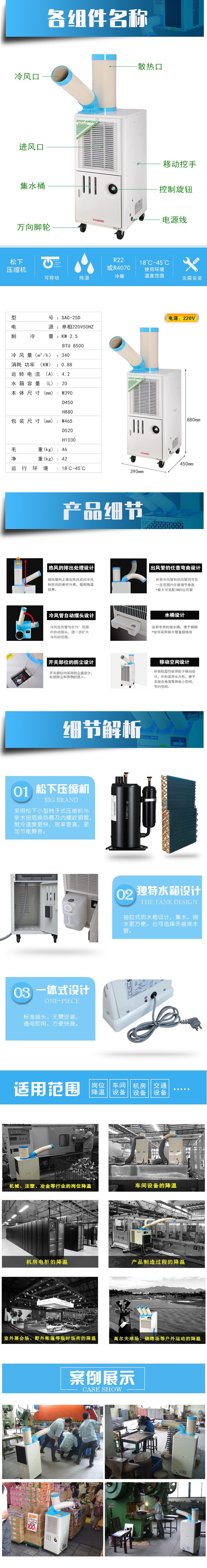 3、需要通风、无法封闭的大面积场所降温,如:室外展会场,酒店后场,工地等整体空间安装空调困难的场所,给工作人员祛暑降温,提供凉爽舒适的工作环境。